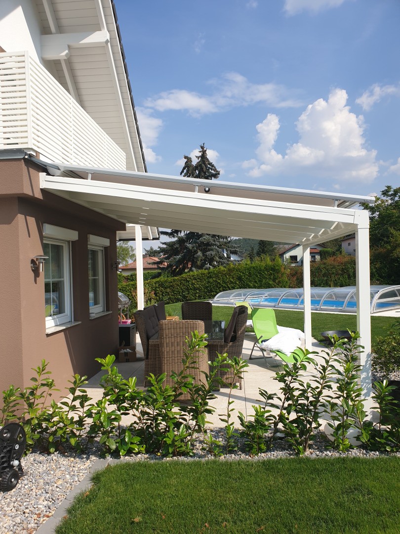 Pergola LIGHT to doskonałe rozwiązanie do mniejszych konstrukcji i lekkich zadaszeń. Zachwyca subtelnymi liniami, eleganckim designem oraz doskonałą stabilnością statyczną. Ze względu na pojedynczą ścianę nośną profilu rynnowego, nie zaleca się montażu przeszkleń obwodowych.