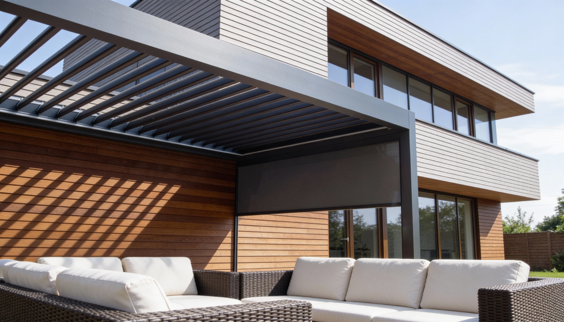 Dla maksymalnego komfortu użytkowania pergolę można doposażyć w oświetlenie LED – w formie listw obwodowych lub punktowych reflektorów w lamelach. Dostępne są także panele solarne oraz automatyka pogodowa, reagująca na wiatr i deszcz, co czyni pergolę inteligentnym i energooszczędnym rozwiązaniem.