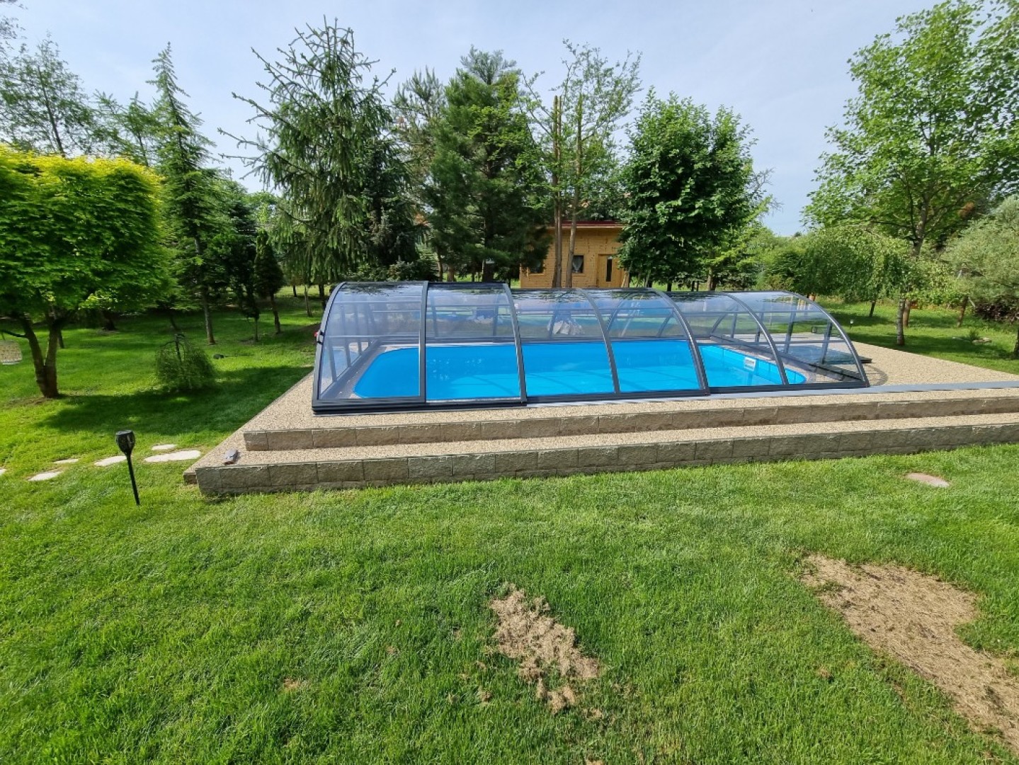 Uniwersalny model zadaszenia basenu o okrągłym przekroju będzie stanowić elegancki i dyskretny element każdego ogrodu.
