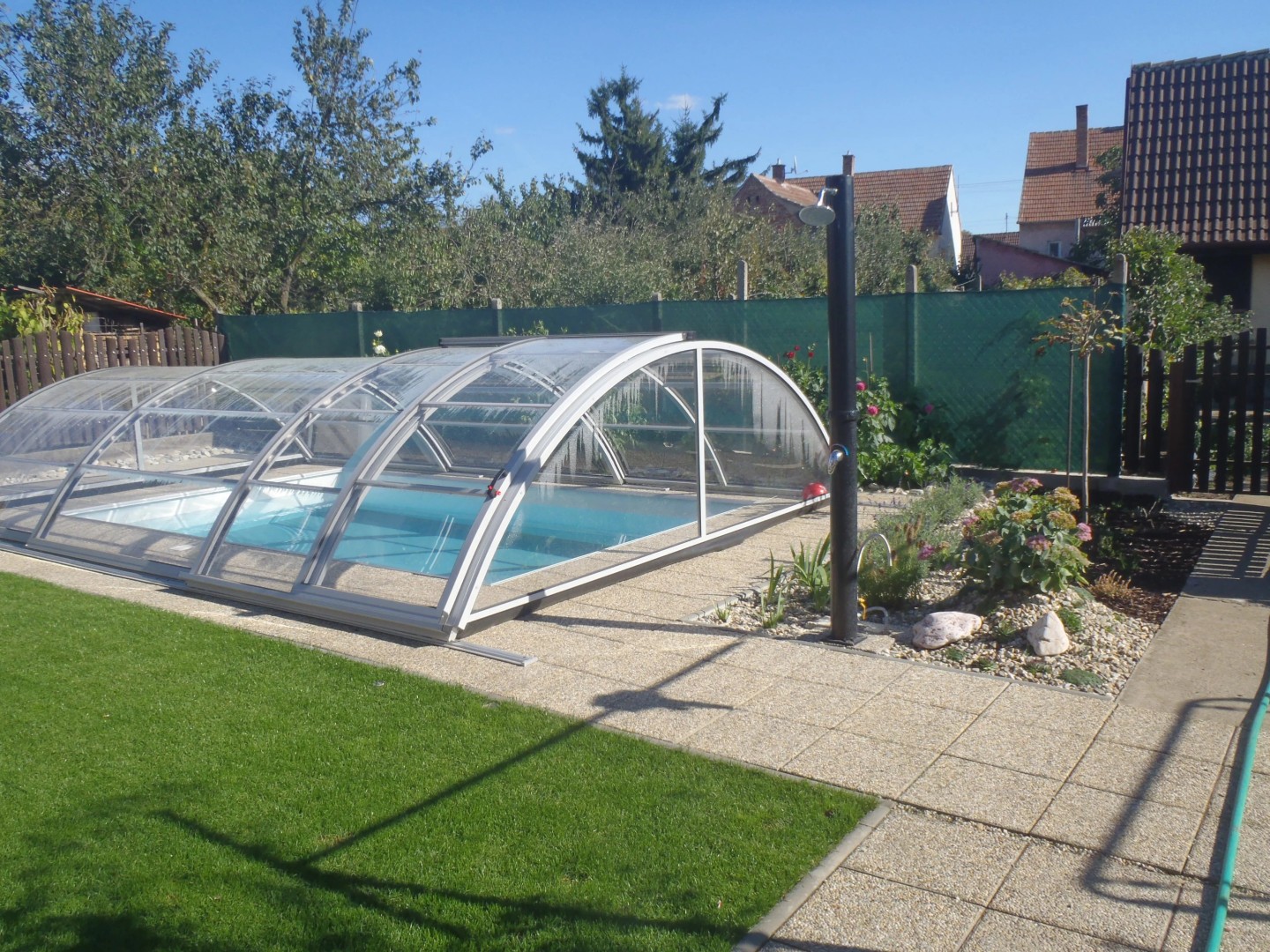 Zadaszenie basenu wyposażone jest w ręczną blokadę w każdym segmencie, która zapewnia bezpieczeństwo podczas obsługi i musi zostać odblokowana przed odsłonięciem basenu. Po zamknięciu wszystkie blokady automatycznie się zabezpieczają.