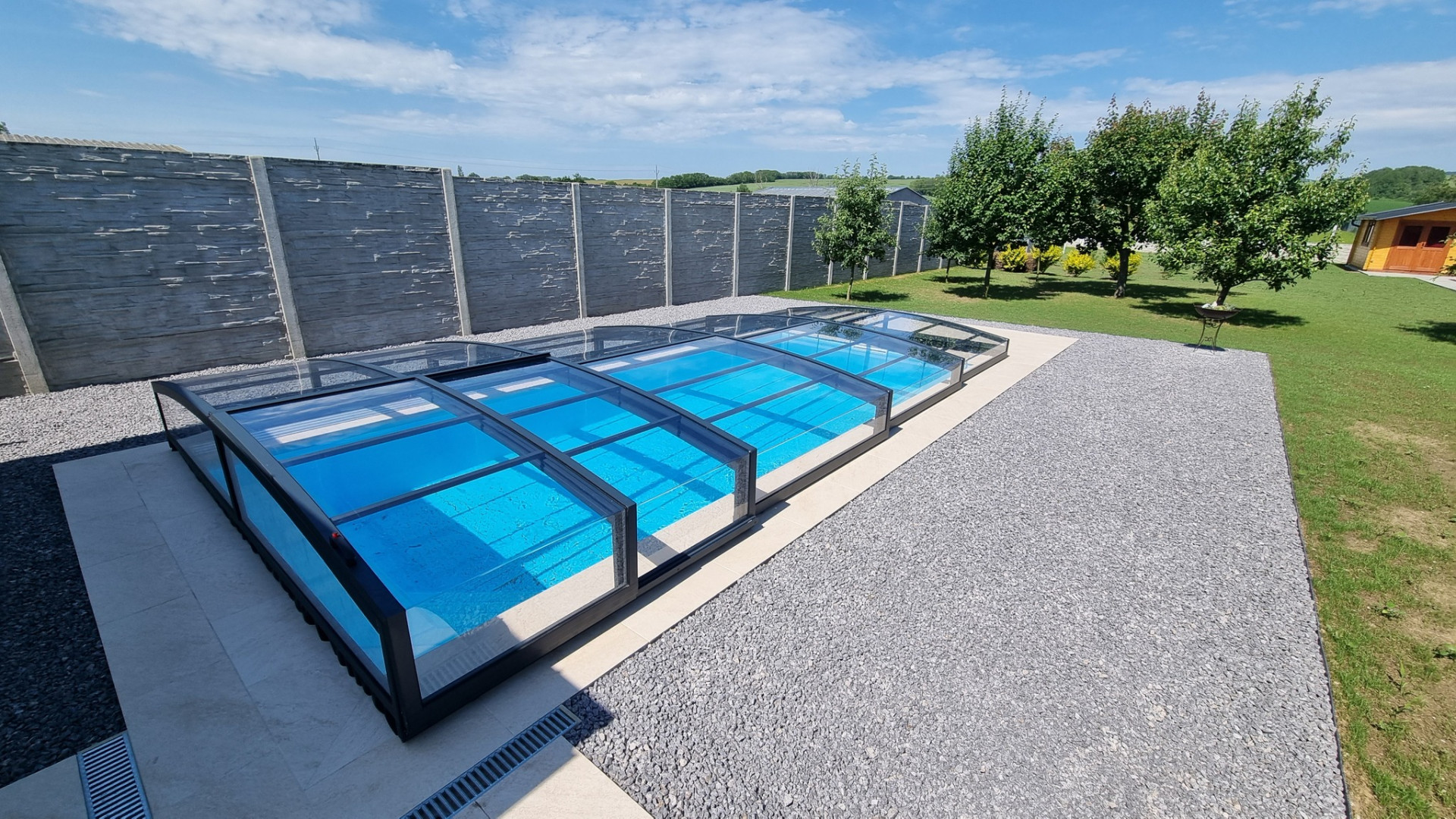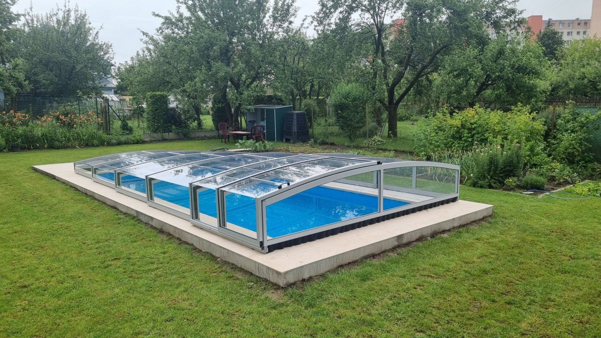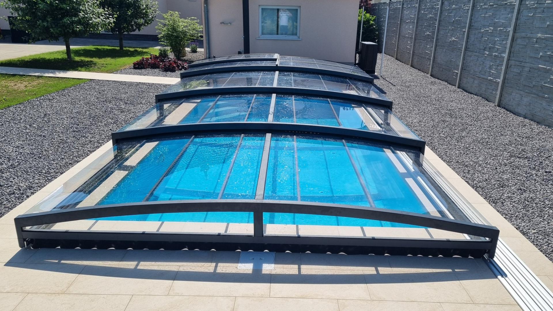 Model PREMIER to lekko podwyższone zadaszenie basenu firmy Mont-Alu. Wysokość zadaszenia basenu w najmniejszym segmencie wynosi od 400 mm, w zależności od liczby segmentów i szerokości zadaszenia.
